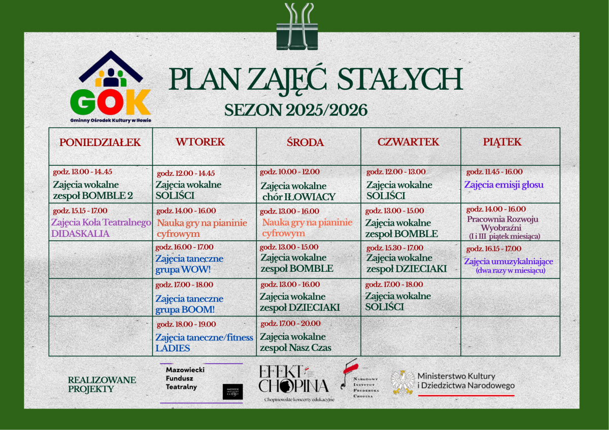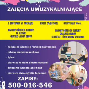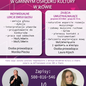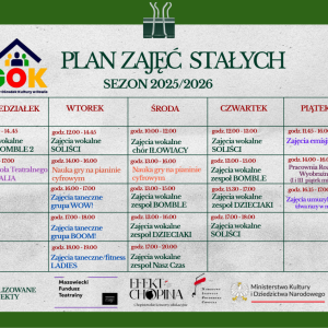 Z przytupem rozpoczęliśmy nowy sezon kulturalny. Kontynuujemy bezpłatne zajęcia wokalne dla zespołów i solistów, naukę gry na pianinie cyfrowym oraz zajęcia teatralne. W naszej ofercie są również płatne zajęcia taneczne dla dzieci i fitness dla dorosłych, emisja głosu i zajęcia umuzyklnijące. Nowością jest nauka gry na perkusji oraz zajecia w pracowni rozwoju wyobraźni. Zapraszamy:) Możesz dołaczyć w każdej chwili, u nas nabór trwa cały rok.